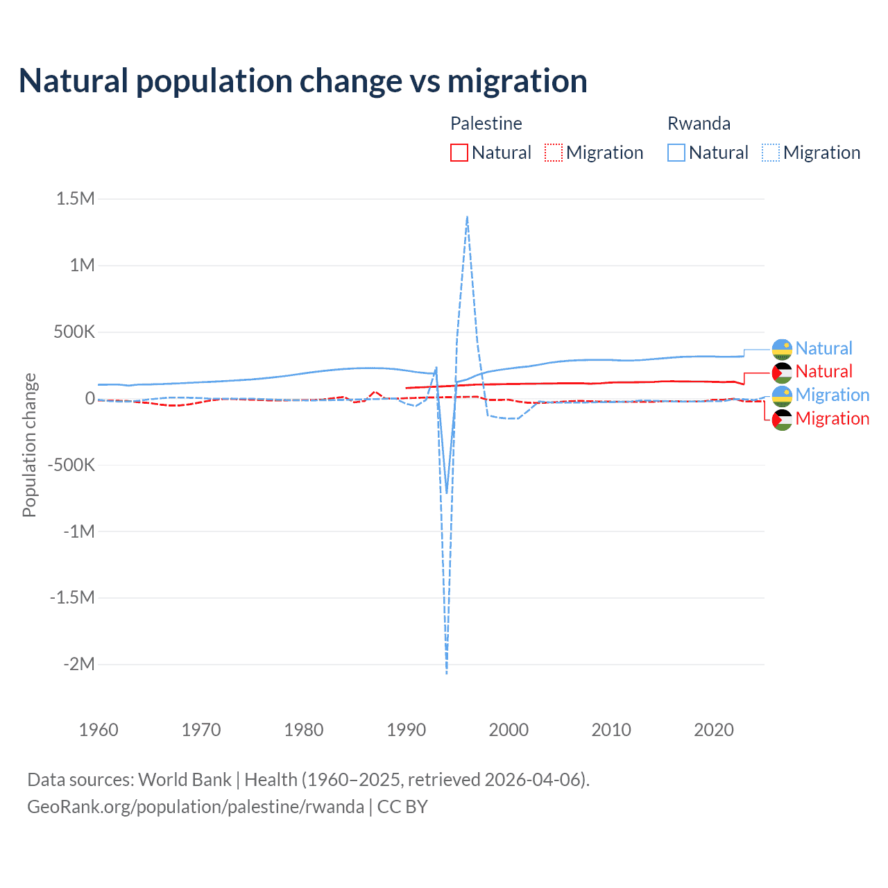 Over the last 10 years, 85.7% of the population change in Palestine is from natural causes (a gain of 1,218,010 people) and 14.3% is from migration (a loss of 202,820 people). In Rwanda 93.8% is from natural causes (a gain of 3,081,296 people) and 6.18% is from migration (a loss of 203,035 people).