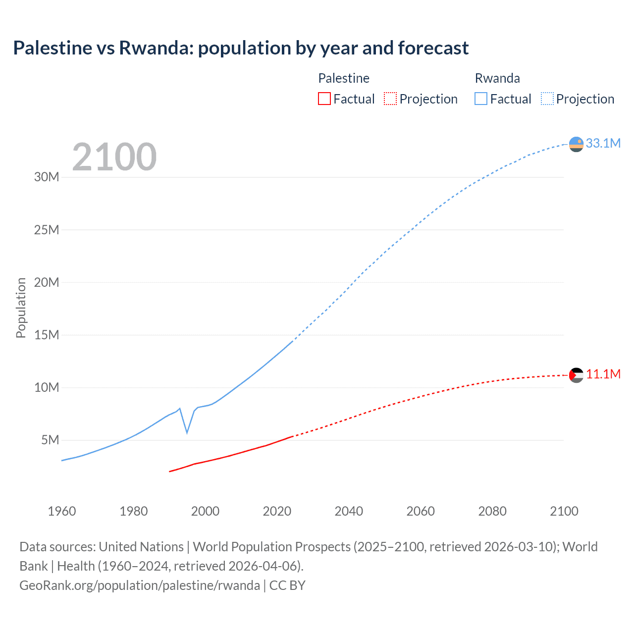 Palestine vs Rwanda: population by year and forecast