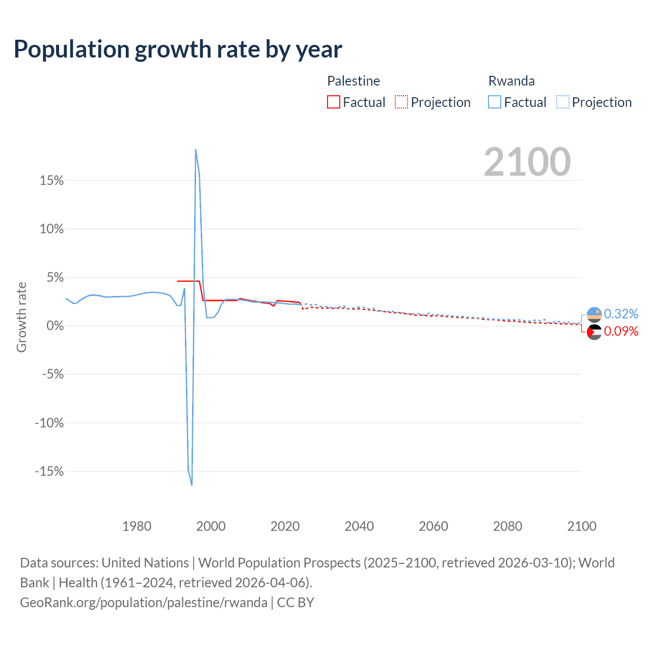 - For the last 10 years, Palestine has had an average growth rate of +2.4% per year vs +2.31% in Rwanda.