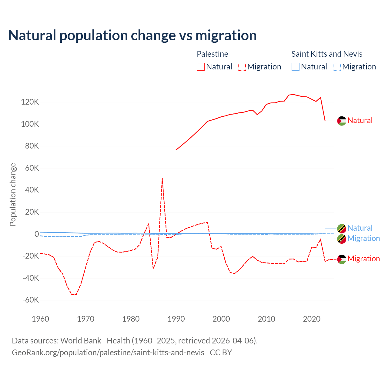 Over the last 10 years, 85.7% of the population change in Palestine is from natural causes (a gain of 1,218,010 people) and 14.3% is from migration (a loss of 202,820 people). In Saint Kitts and Nevis 44.9% is from natural causes (a gain of 1,225 people) and 55.1% is from migration (a loss of 1,506 people).