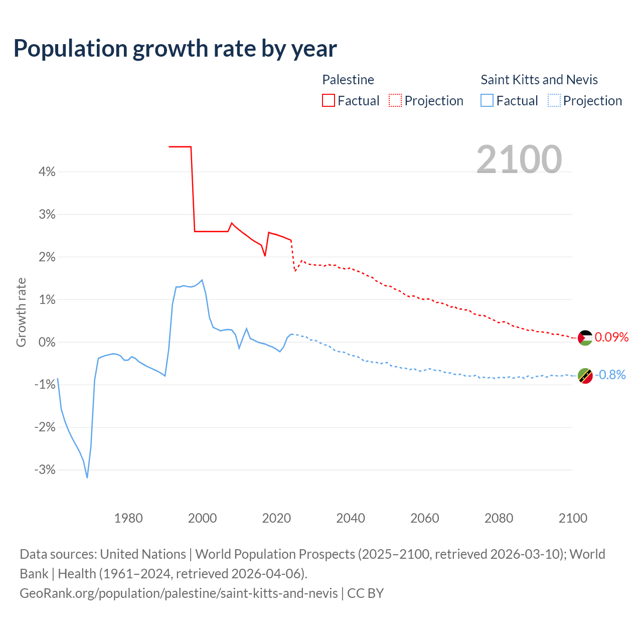 Palestine vs Saint Kitts and Nevis: population by year and forecast