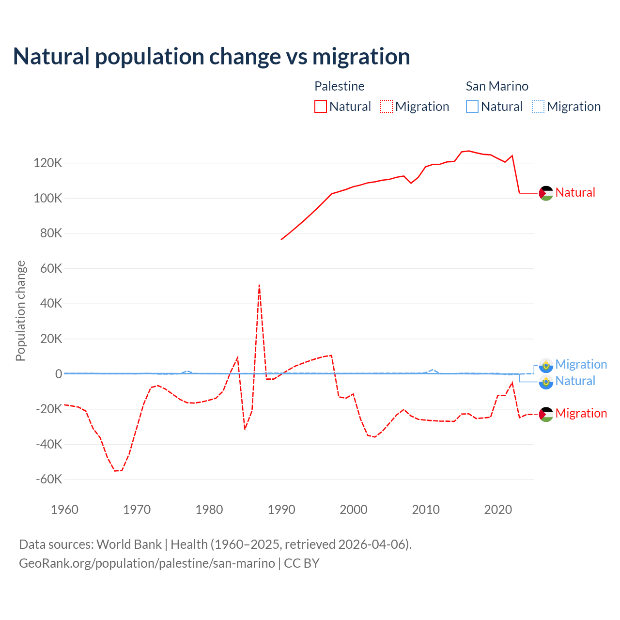 Over the last 10 years, 85.7% of the population change in Palestine is from natural causes (a gain of 1,218,010 people) and 14.3% is from migration (a loss of 202,820 people). In San Marino 40.9% is from natural causes (a loss of 358 people) and 59.1% is from migration (a gain of 517 people).