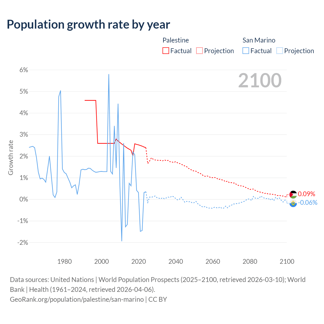 - For the last 10 years, Palestine has had an average growth rate of +2.4% per year vs +0.26% in San Marino.
