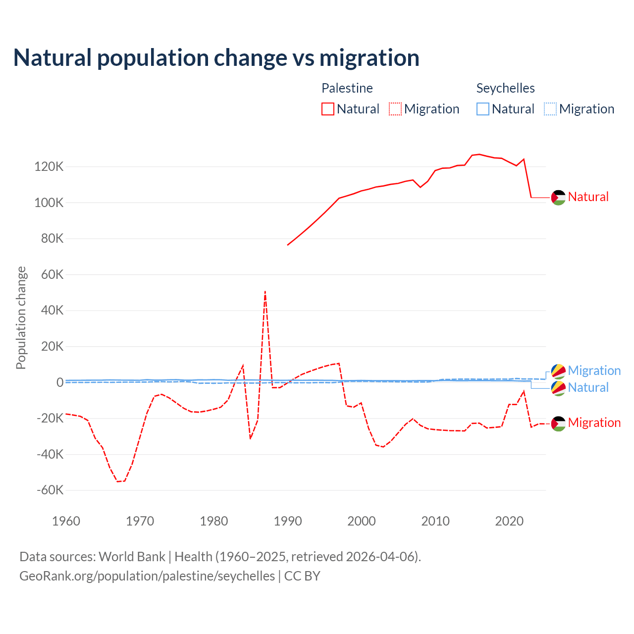 Over the last 10 years, 85.7% of the population change in Palestine is from natural causes (a gain of 1,218,010 people) and 14.3% is from migration (a loss of 202,820 people). In the Seychelles 31.4% is from natural causes (a gain of 8,122 people) and 68.6% is from migration (a gain of 17,748 people).