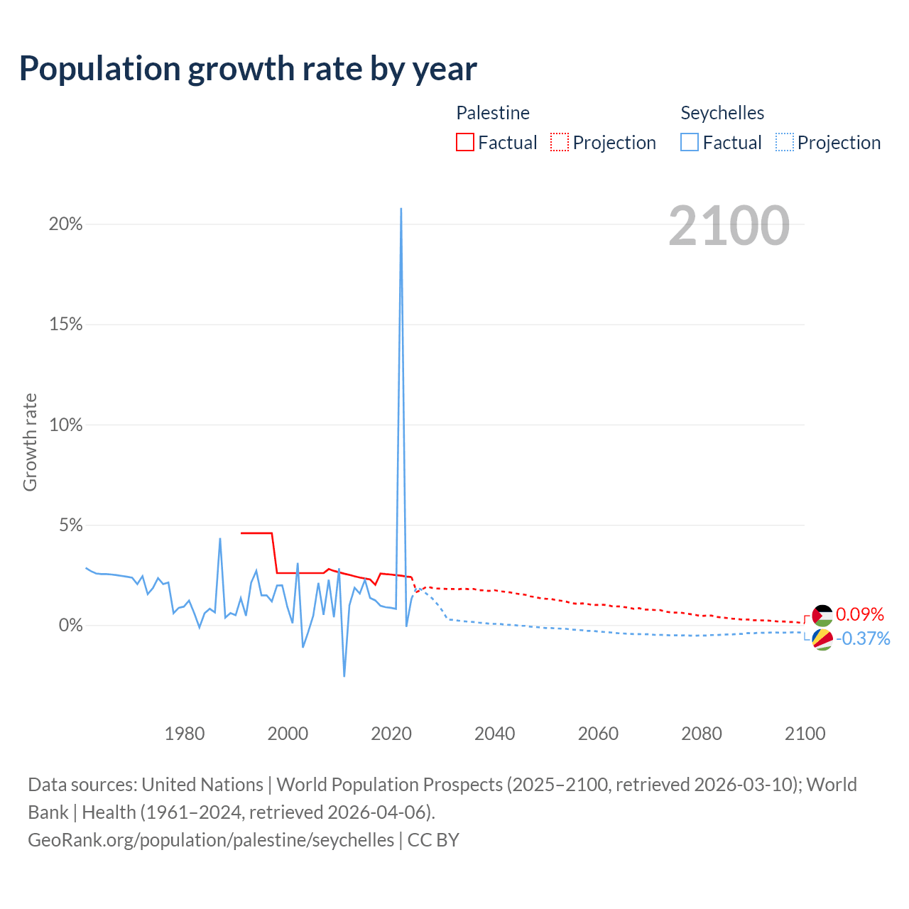 - For the last 10 years, Palestine has had an average growth rate of +2.4% per year vs +2.9% in the Seychelles.