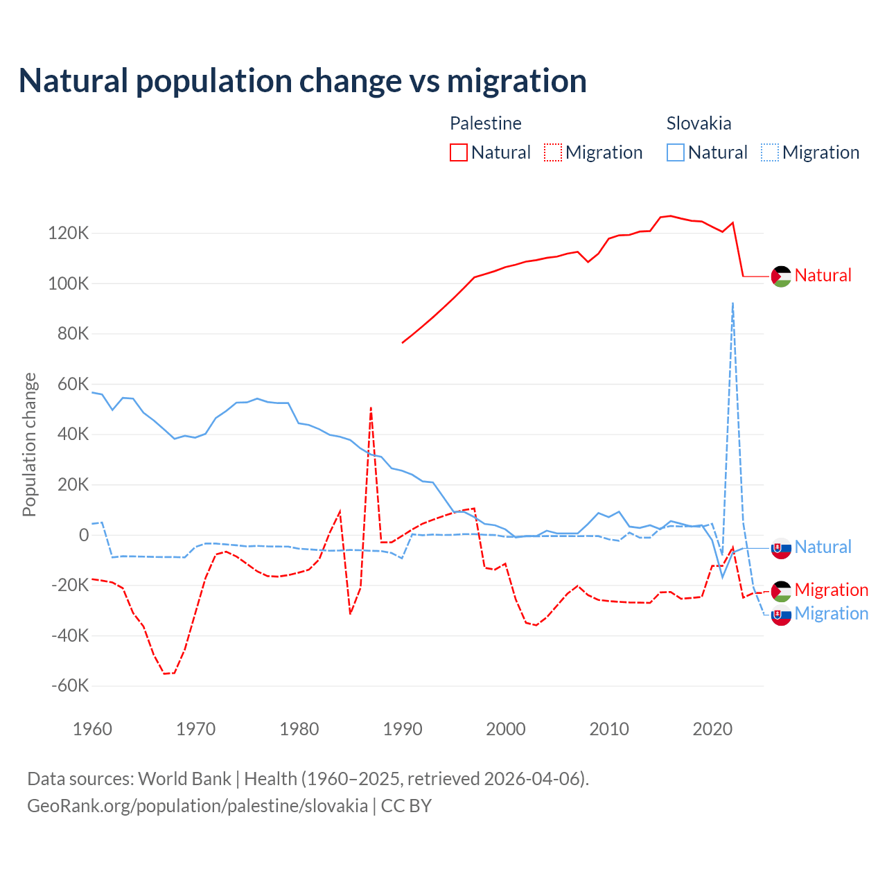Over the last 10 years, 85.7% of the population change in Palestine is from natural causes (a gain of 1,218,010 people) and 14.3% is from migration (a loss of 202,820 people). In Slovakia 7.47% is from natural causes (a loss of 8,728 people) and 92.5% is from migration (a gain of 108,156 people).