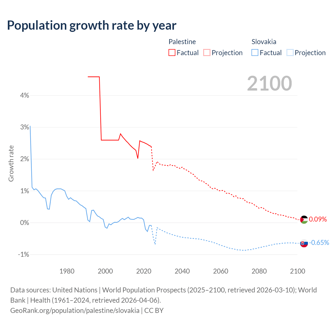 - For the last 10 years, Palestine has had an average growth rate of +2.4% per year vs +0.01% in Slovakia.