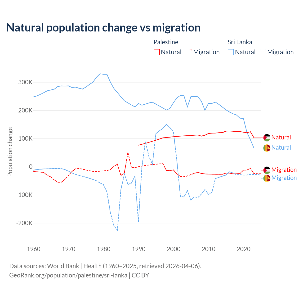 Over the last 10 years, 85.7% of the population change in Palestine is from natural causes (a gain of 1,218,010 people) and 14.3% is from migration (a loss of 202,820 people). In Sri Lanka 85.3% is from natural causes (a gain of 1,605,749 people) and 14.7% is from migration (a loss of 276,121 people).