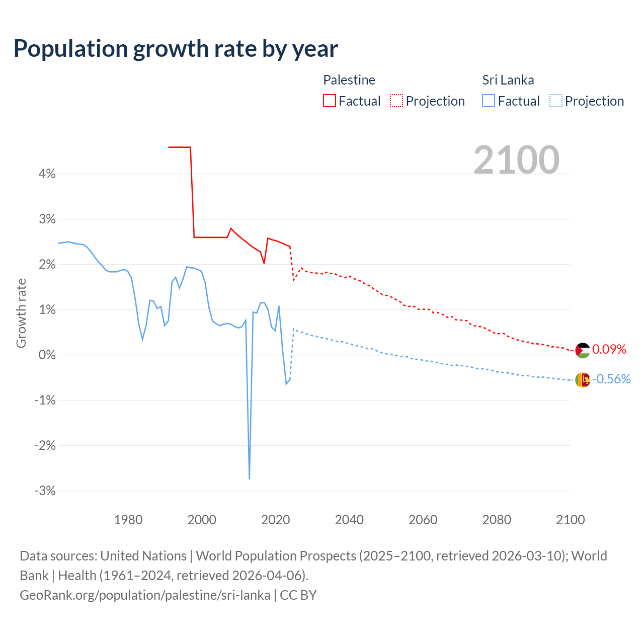 - For the last 10 years, Palestine has had an average growth rate of +2.4% per year vs +0.57% in Sri Lanka.