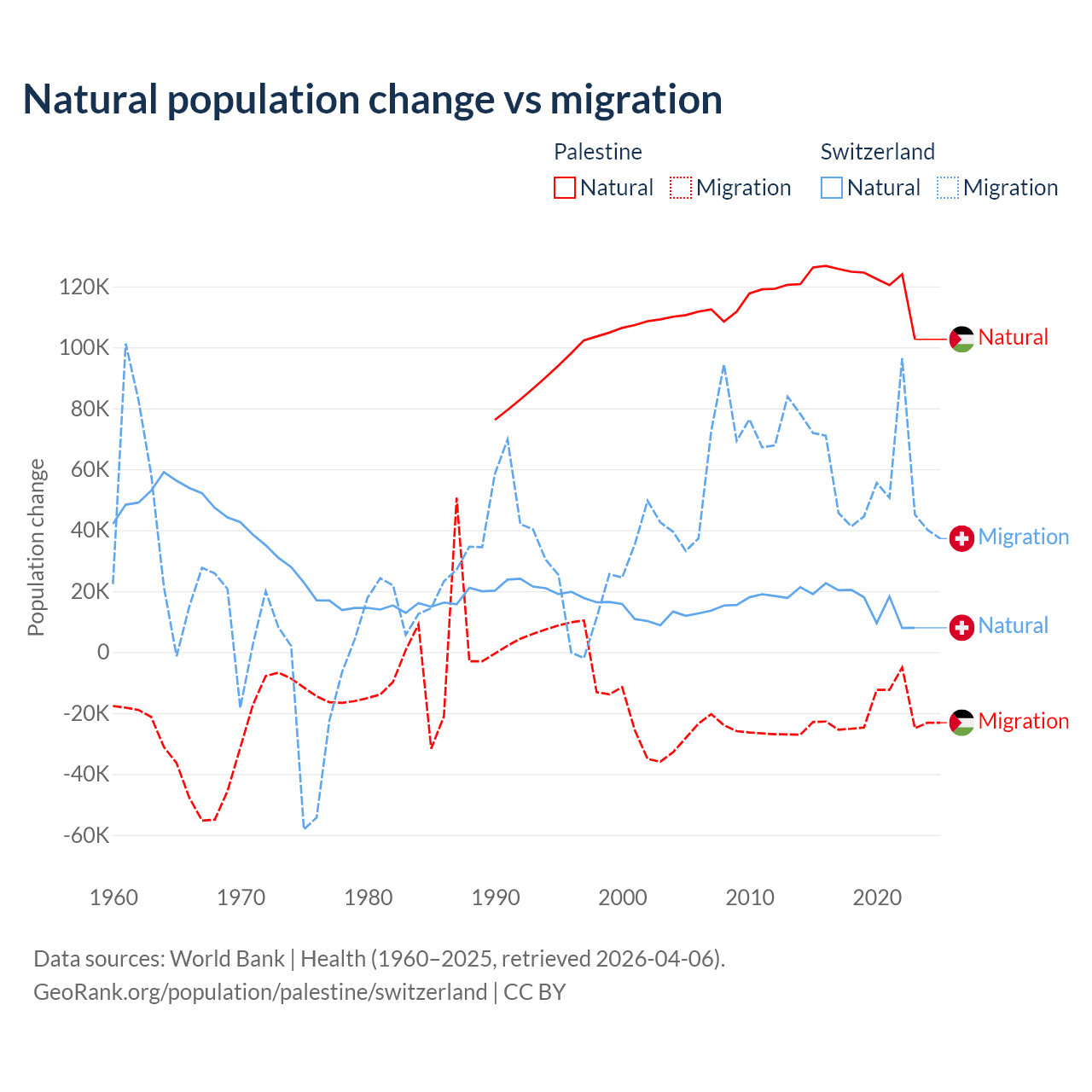 Over the last 10 years, 85.7% of the population change in Palestine is from natural causes (a gain of 1,218,010 people) and 14.3% is from migration (a loss of 202,820 people). In Switzerland 21.6% is from natural causes (a gain of 165,354 people) and 78.4% is from migration (a gain of 600,145 people).