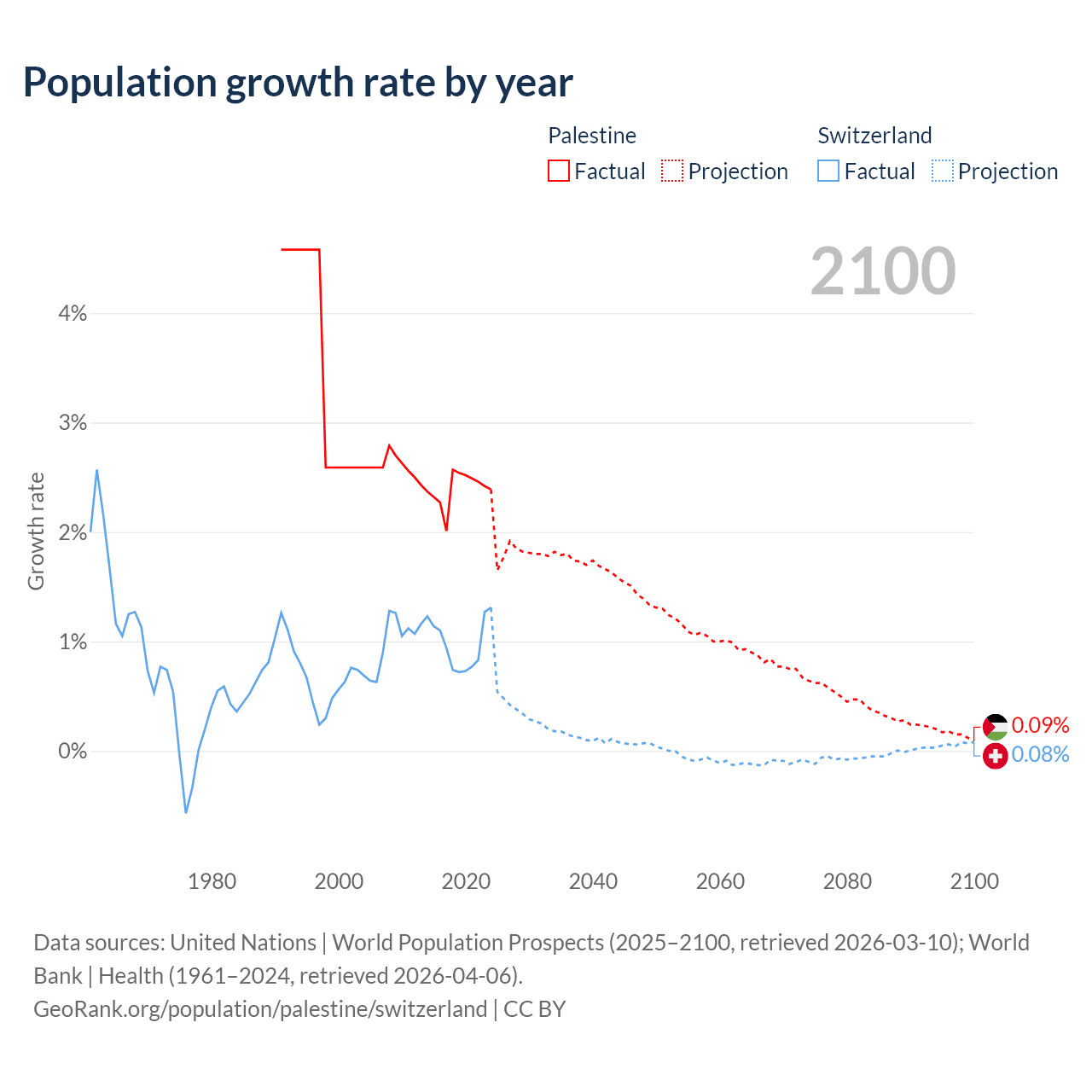 - For the last 10 years, Palestine has had an average growth rate of +2.4% per year vs +0.98% in Switzerland.