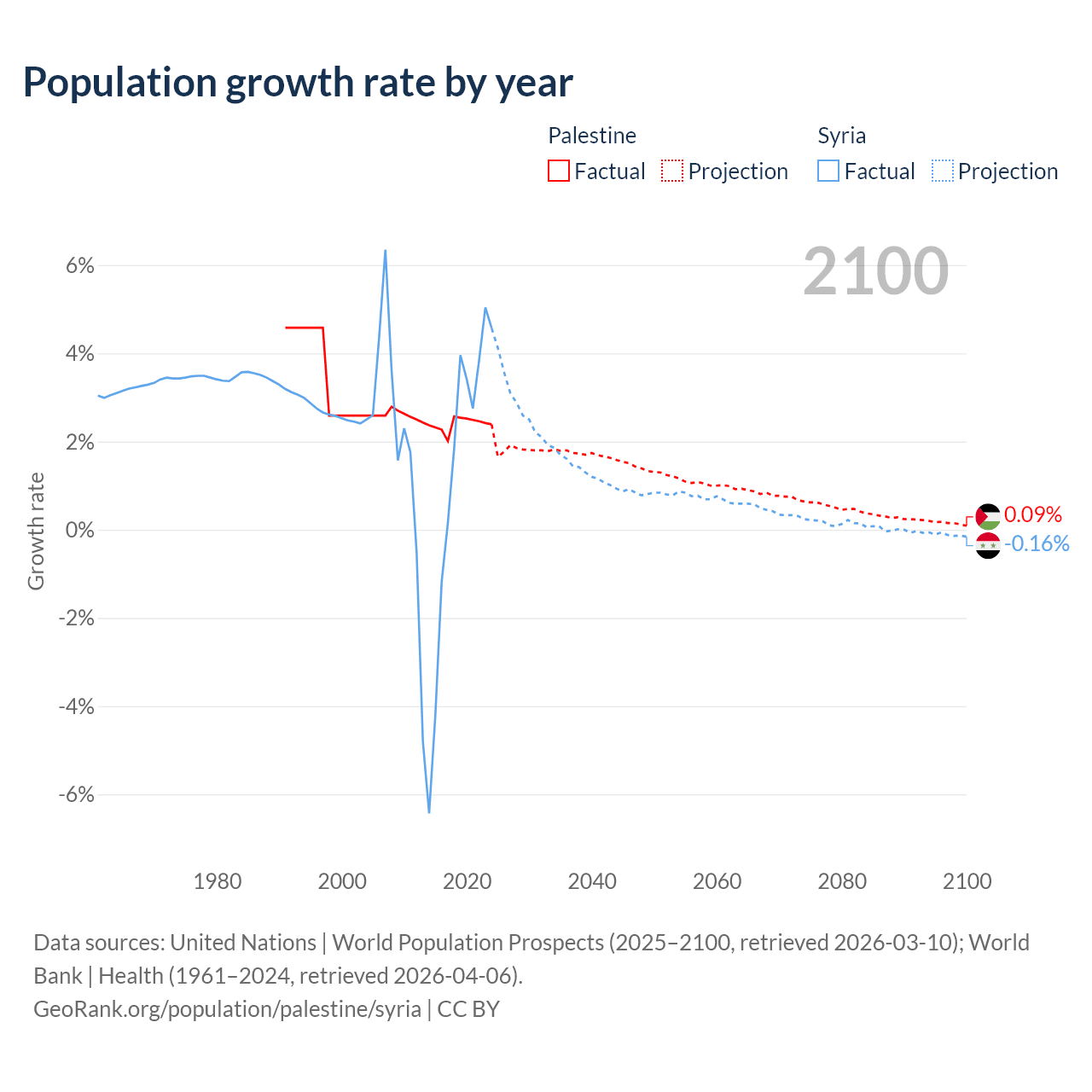 - For the last 10 years, Palestine has had an average growth rate of +2.4% per year vs +1.25% in Syria.
