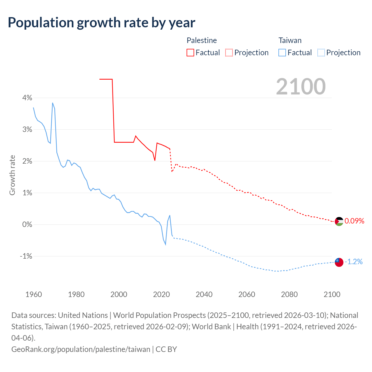 Data sources: World Bank | Health (1960–2024, retrieved 2026-04-06); United Nations | World Population Prospects (1960–2026, retrieved 2026-03-10); U.S. Census Bureau (1960–2025, retrieved 2026-02-08); National Statistics, Taiwan (1960–2025, retrieved 2026-02-09); Central Intelligence Agency (CIA) (2000–2019, retrieved 2026-02-20).