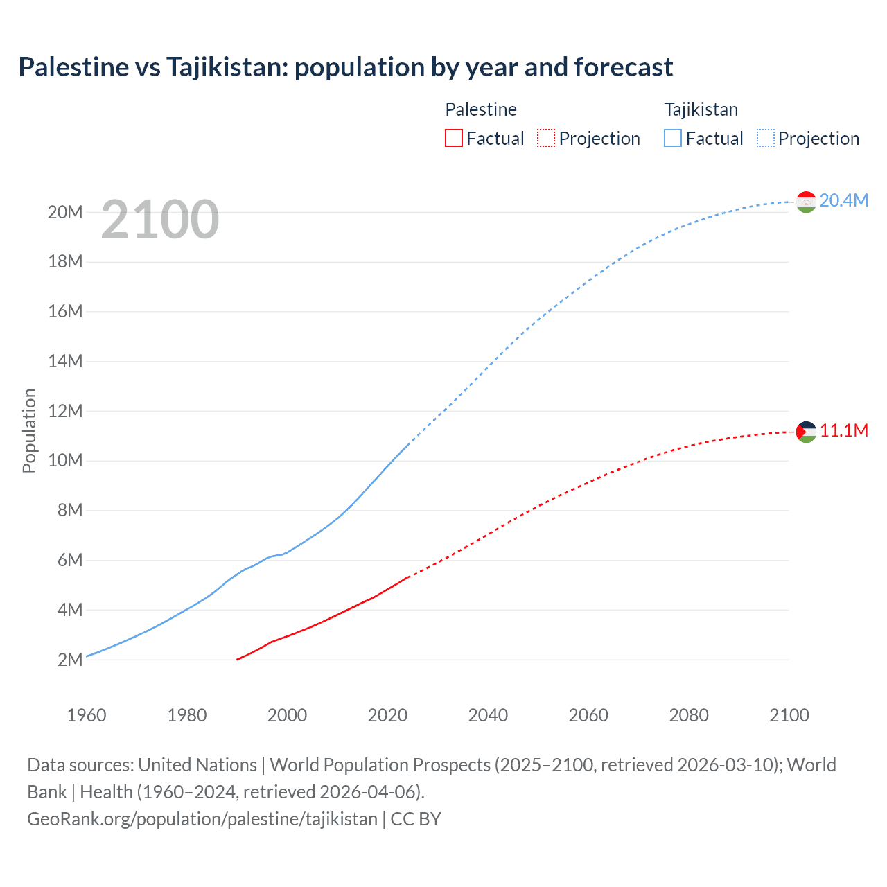 The latest officially reported population of Palestine was 5,289,152 in 2024 vs 10,590,927 people in Tajikistan in 2024. In 2026, based on the adjusted UN estimation, the current Palestine's population is 5,500,288 people compared to 11,038,274 in Tajikistan.