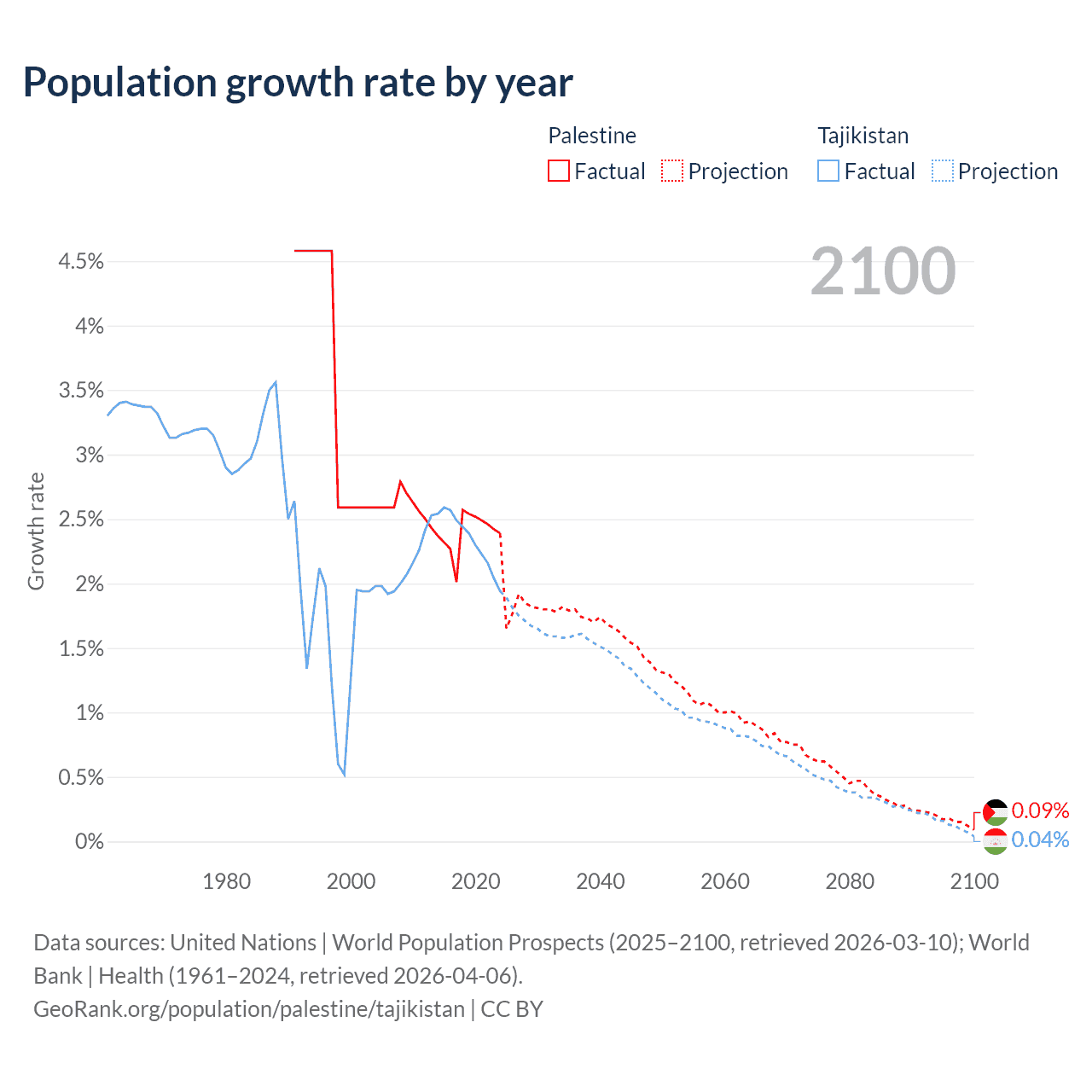 - For the last 10 years, Palestine has had an average growth rate of +2.4% per year vs +2.33% in Tajikistan.