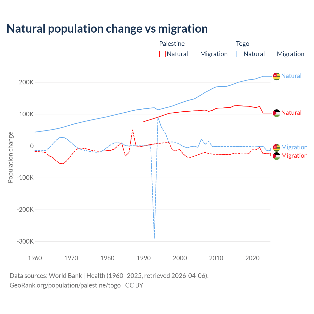 Over the last 10 years, 85.7% of the population change in Palestine is from natural causes (a gain of 1,218,010 people) and 14.3% is from migration (a loss of 202,820 people). In Togo 99.1% is from natural causes (a gain of 2,052,115 people) and 0.86% is from migration (a loss of 17,852 people).