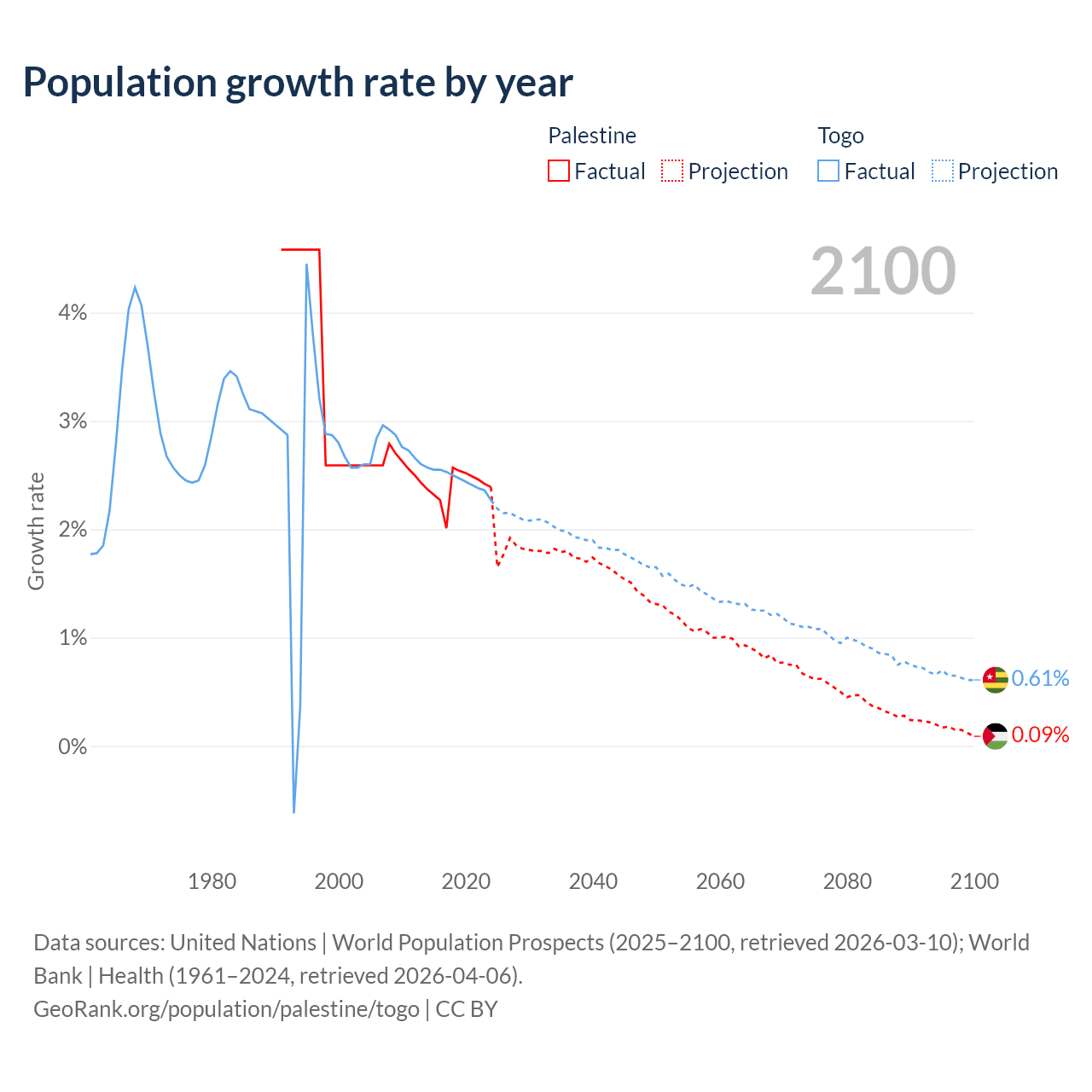 - For the last 10 years, Palestine has had an average growth rate of +2.4% per year vs +2.46% in Togo.
