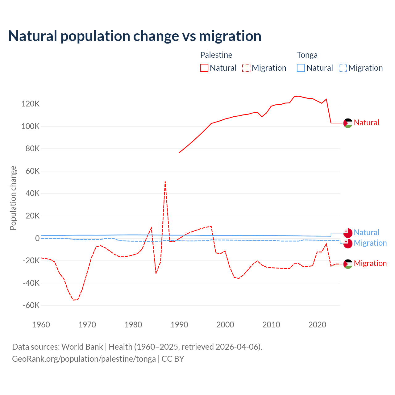 Over the last 10 years, 85.7% of the population change in Palestine is from natural causes (a gain of 1,218,010 people) and 14.3% is from migration (a loss of 202,820 people). In Tonga 46.9% is from natural causes (a gain of 18,919 people) and 53.1% is from migration (a loss of 21,384 people).