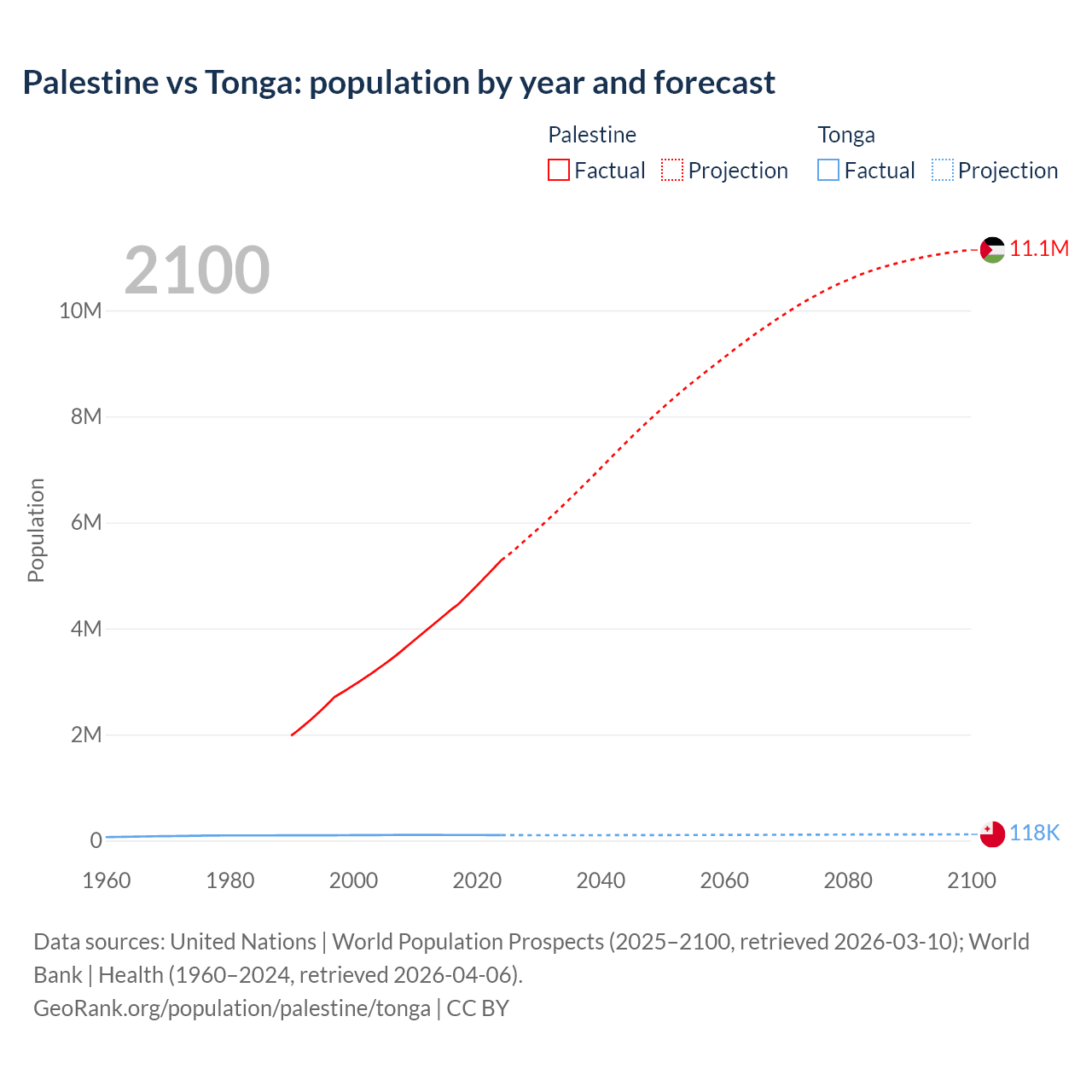The latest officially reported population of Palestine was 5,289,152 in 2024 vs 104,175 people in Tonga in 2024. In 2026, based on the adjusted UN estimation, the current Palestine's population is 5,500,288 people compared to 103,309 in Tonga.