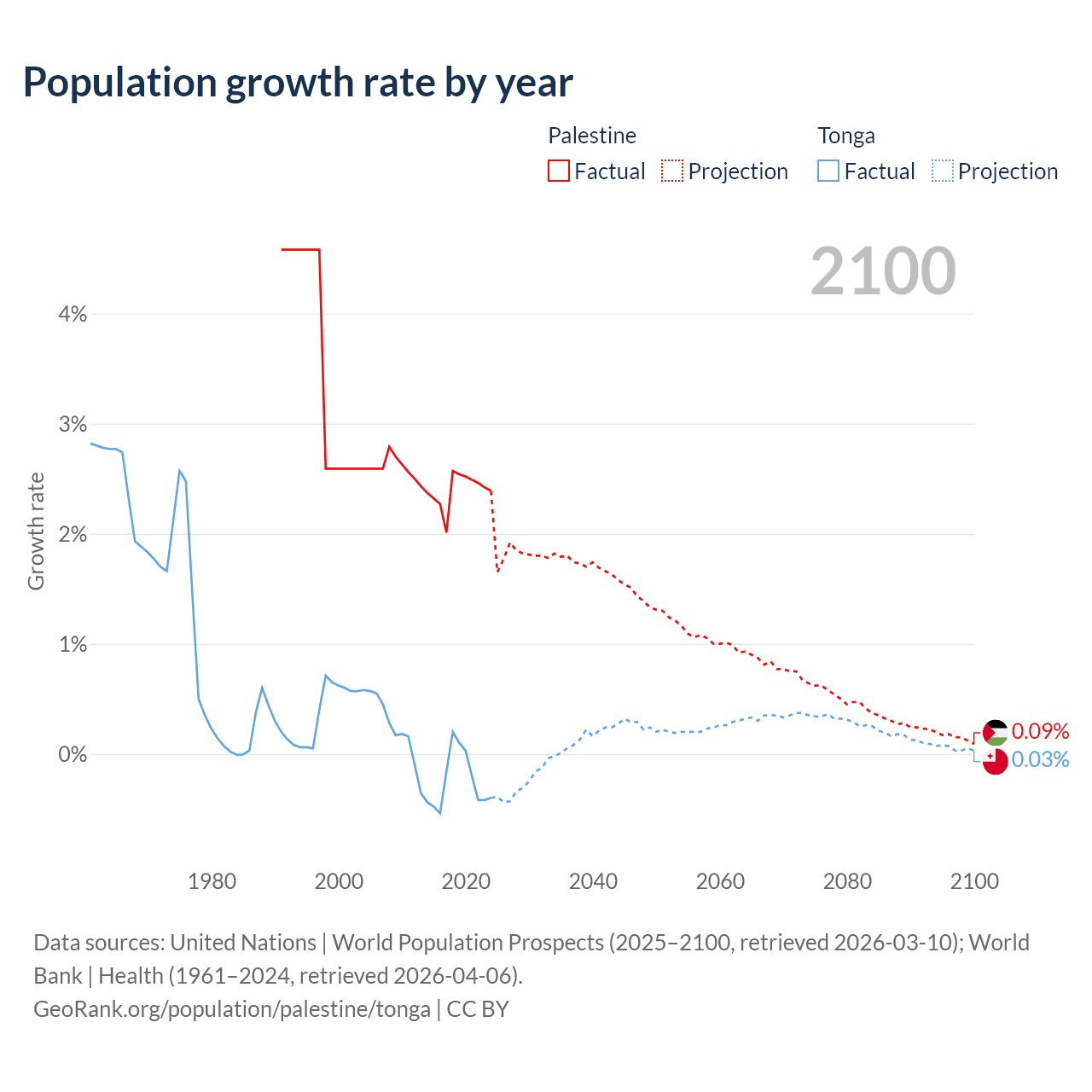 - For the last 10 years, Palestine has had an average growth rate of +2.4% per year vs -0.25% in Tonga.