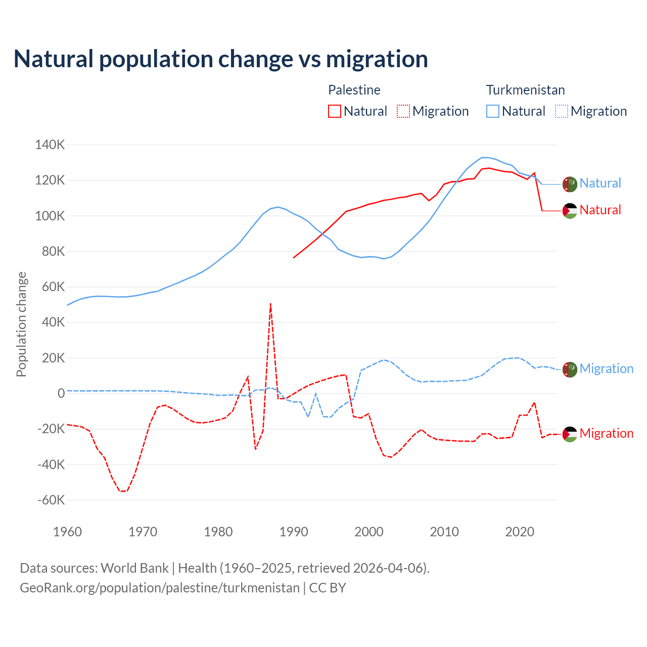 Over the last 10 years, 85.7% of the population change in Palestine is from natural causes (a gain of 1,218,010 people) and 14.3% is from migration (a loss of 202,820 people). In Turkmenistan 89.2% is from natural causes (a gain of 1,270,228 people) and 10.8% is from migration (a gain of 154,379 people).
