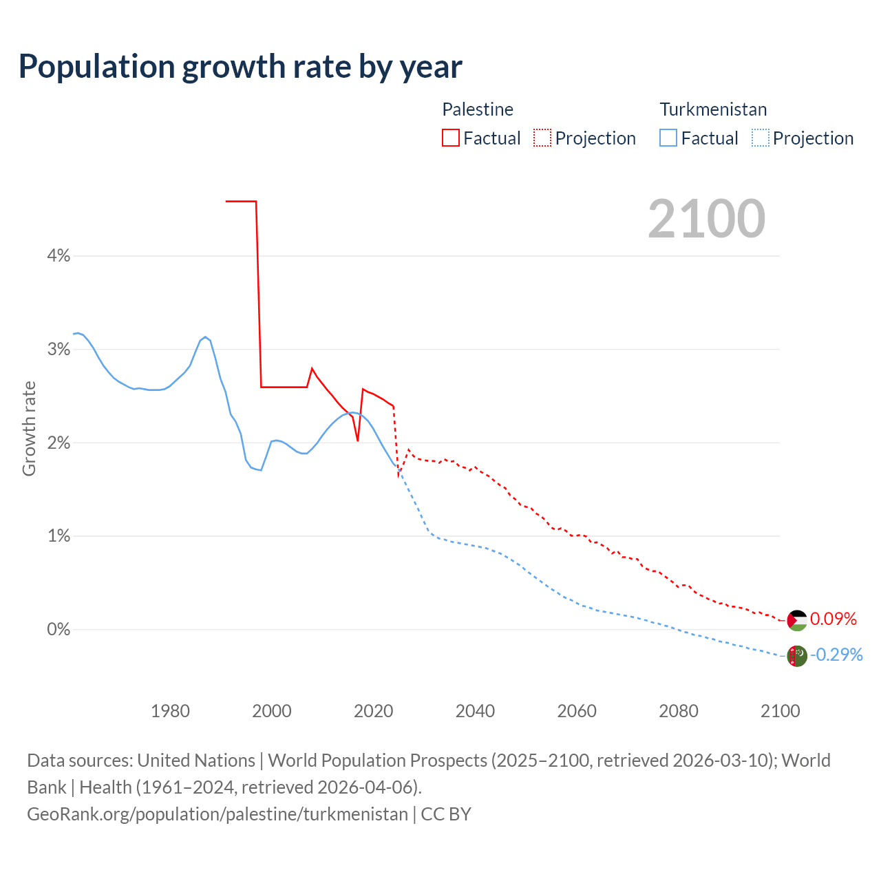 - For the last 10 years, Palestine has had an average growth rate of +2.4% per year vs +2.14% in Turkmenistan.