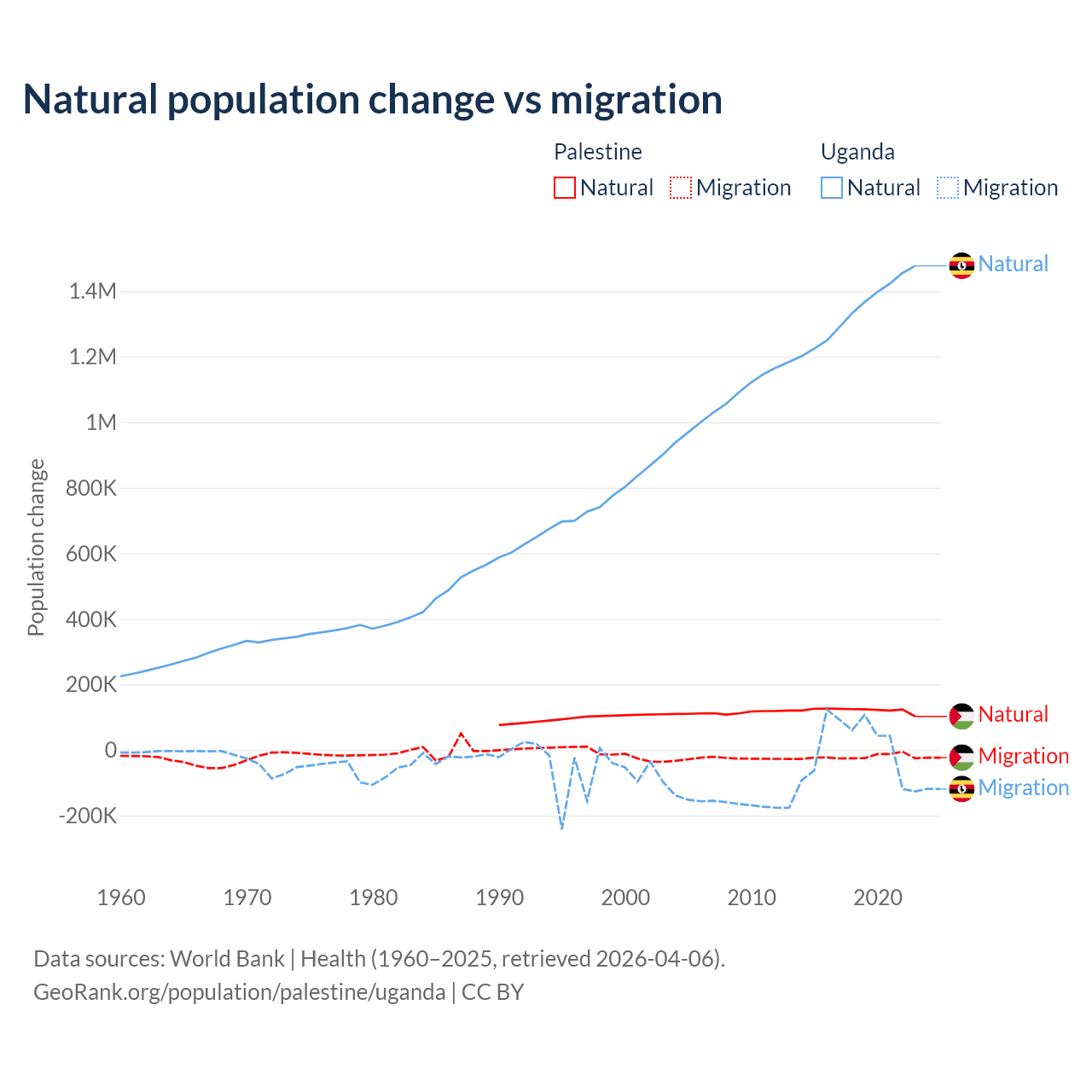 Over the last 10 years, 85.7% of the population change in Palestine is from natural causes (a gain of 1,218,010 people) and 14.3% is from migration (a loss of 202,820 people). In Uganda 99.5% is from natural causes (a gain of 13,419,712 people) and 0.53% is from migration (a gain of 71,457 people).