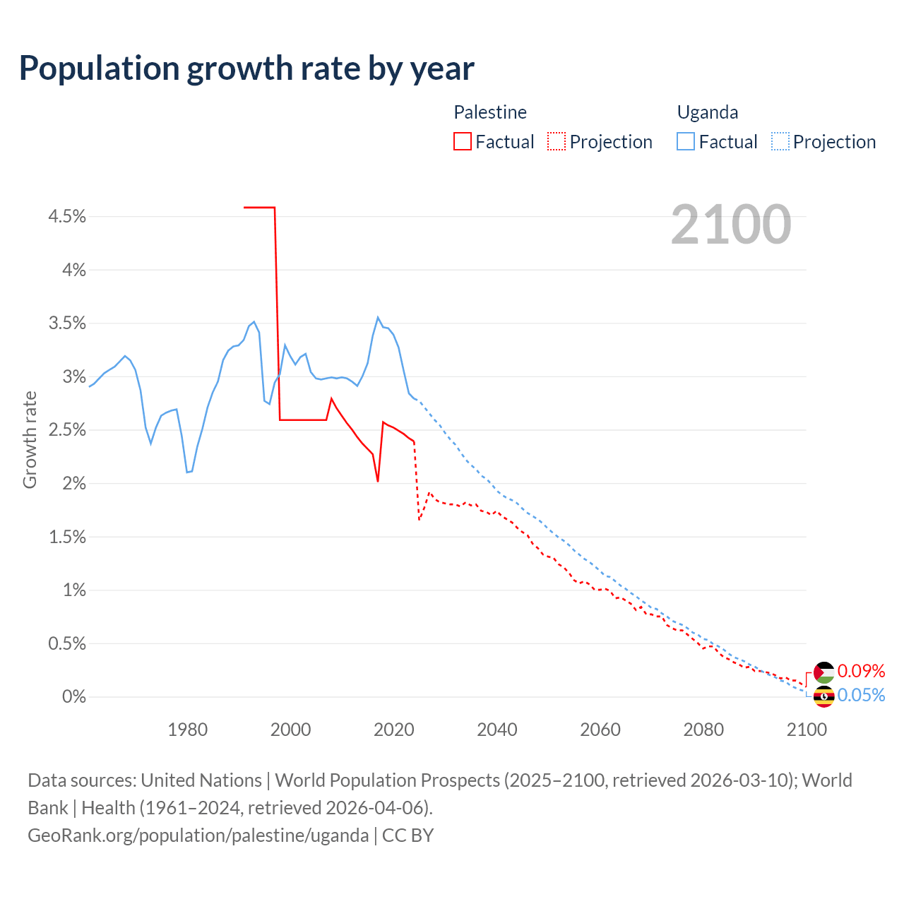 - For the last 10 years, Palestine has had an average growth rate of +2.4% per year vs +3.21% in Uganda.