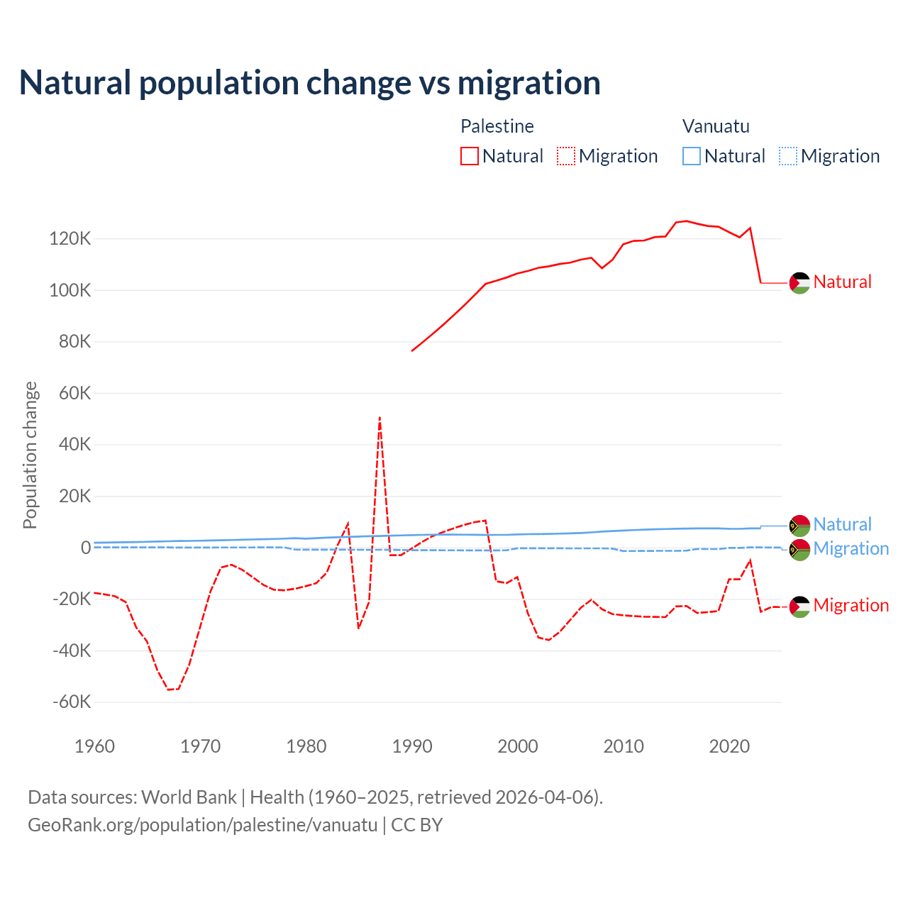 Over the last 10 years, 85.7% of the population change in Palestine is from natural causes (a gain of 1,218,010 people) and 14.3% is from migration (a loss of 202,820 people). In Vanuatu 92.2% is from natural causes (a gain of 72,941 people) and 7.81% is from migration (a loss of 6,181 people).