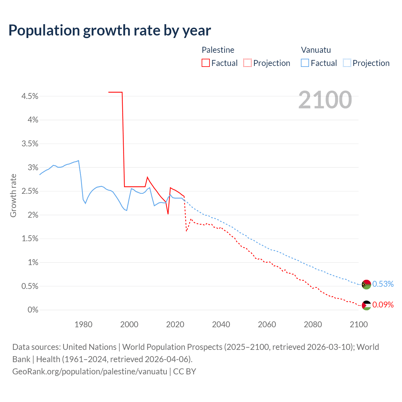 - For the last 10 years, Palestine has had an average growth rate of +2.4% per year vs +2.33% in Vanuatu.