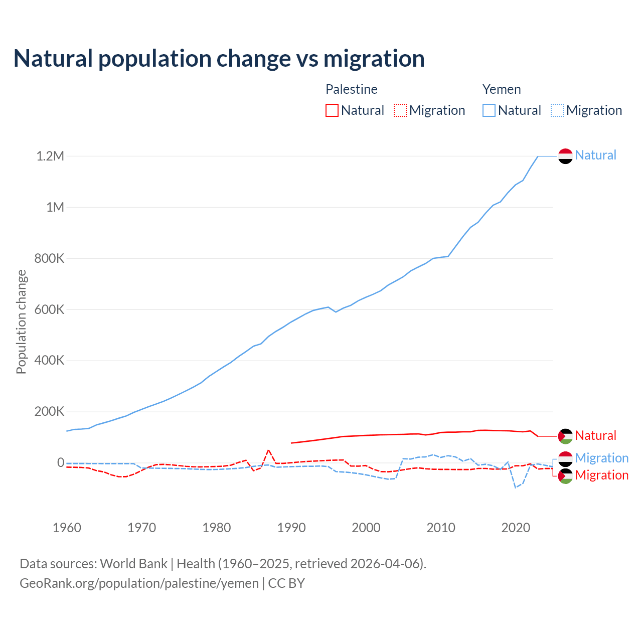 Over the last 10 years, 85.7% of the population change in Palestine is from natural causes (a gain of 1,218,010 people) and 14.3% is from migration (a loss of 202,820 people). In Yemen 97.8% is from natural causes (a gain of 10,460,813 people) and 2.17% is from migration (a loss of 231,814 people).