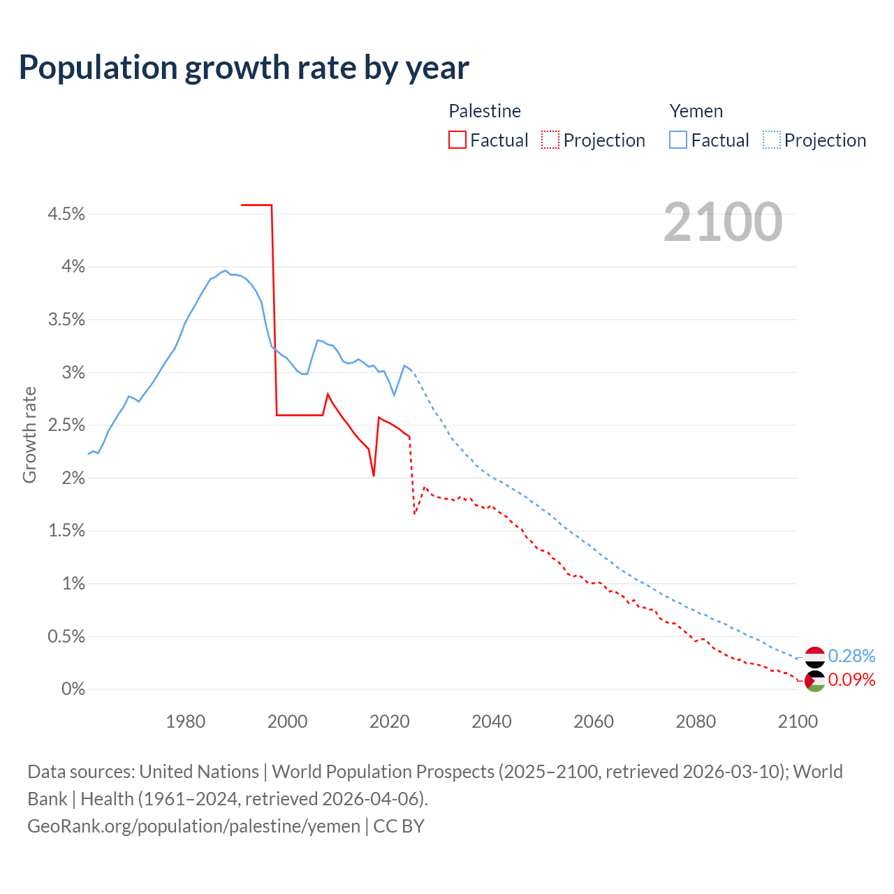 - For the last 10 years, Palestine has had an average growth rate of +2.4% per year vs +3% in Yemen.