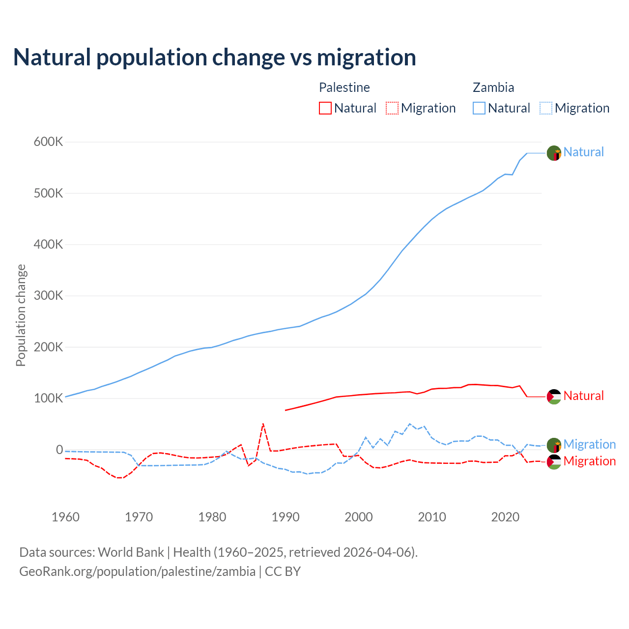Over the last 10 years, 85.7% of the population change in Palestine is from natural causes (a gain of 1,218,010 people) and 14.3% is from migration (a loss of 202,820 people). In Zambia 97.4% is from natural causes (a gain of 5,233,797 people) and 2.58% is from migration (a gain of 138,554 people).