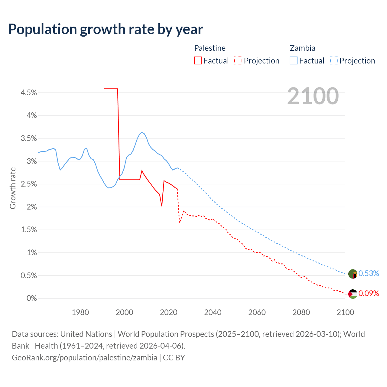 - For the last 10 years, Palestine has had an average growth rate of +2.4% per year vs +3% in Zambia.