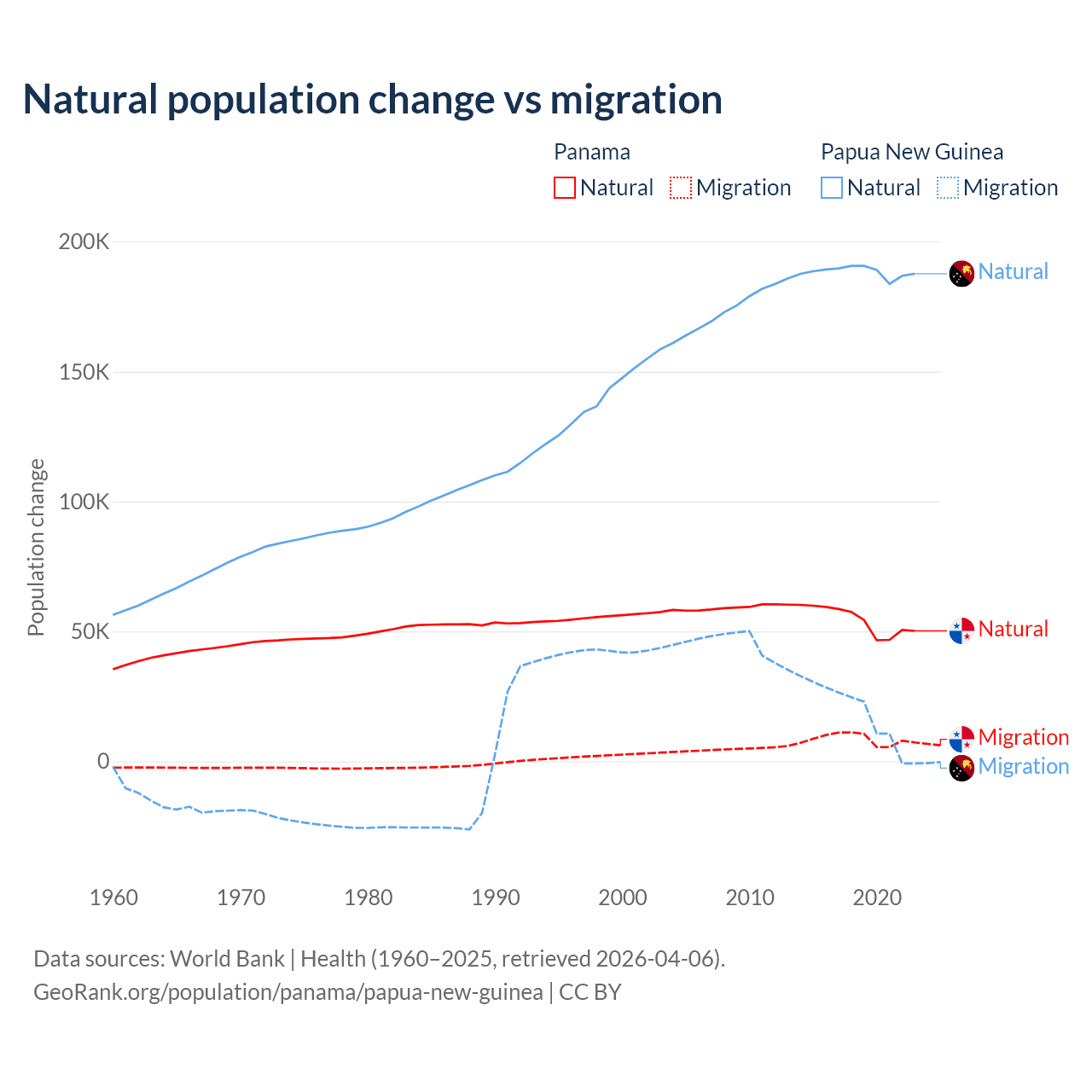 Over the last 10 years, 86.5% of the population change in Panama is from natural causes (a gain of 544,211 people) and 13.5% is from migration (a gain of 84,849 people). In Papua New Guinea 91% is from natural causes (a gain of 1,883,906 people) and 8.98% is from migration (a gain of 185,900 people).