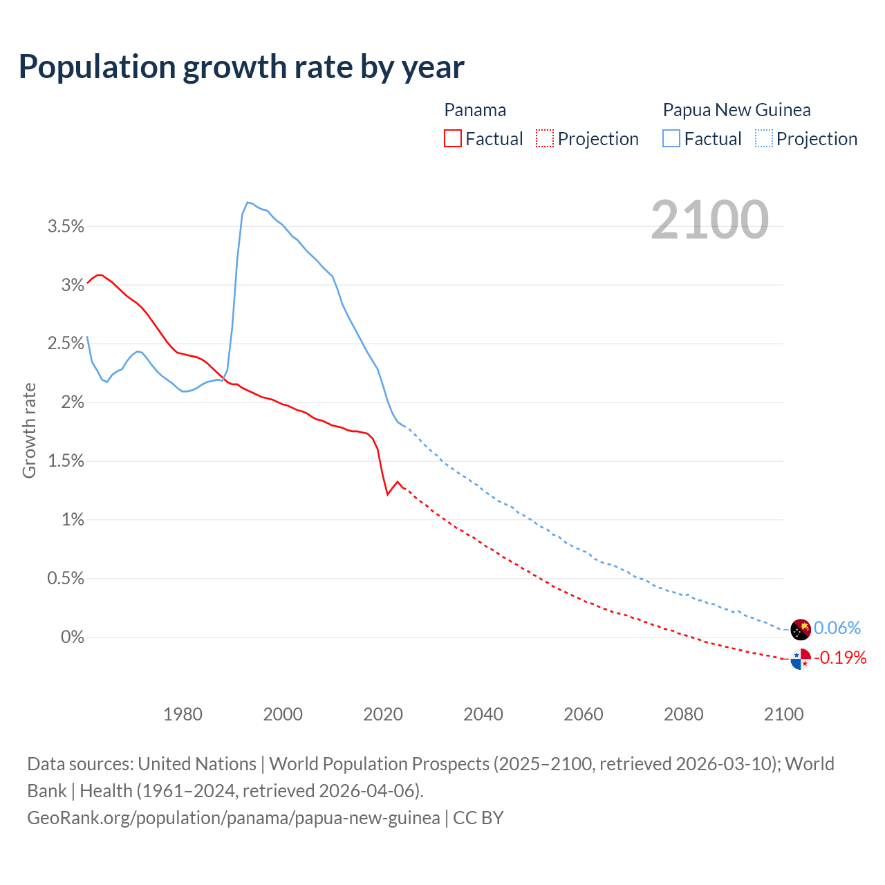- For the last 10 years, Panama has had an average growth rate of +1.52% per year vs +2.23% in Papua New Guinea.