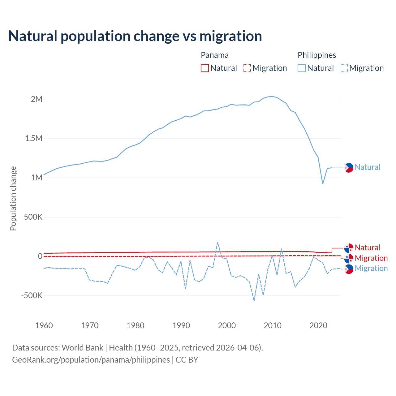Over the last 10 years, 86.5% of the population change in Panama is from natural causes (a gain of 544,211 people) and 13.5% is from migration (a gain of 84,849 people). In the Philippines 88.5% is from natural causes (a gain of 14,279,705 people) and 11.5% is from migration (a loss of 1,848,117 people).
