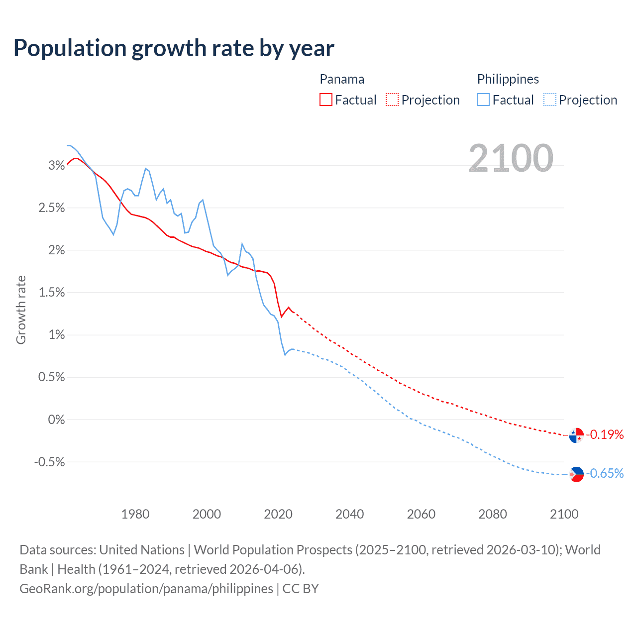 - For the last 10 years, Panama has had an average growth rate of +1.52% per year vs +1.16% in the Philippines.