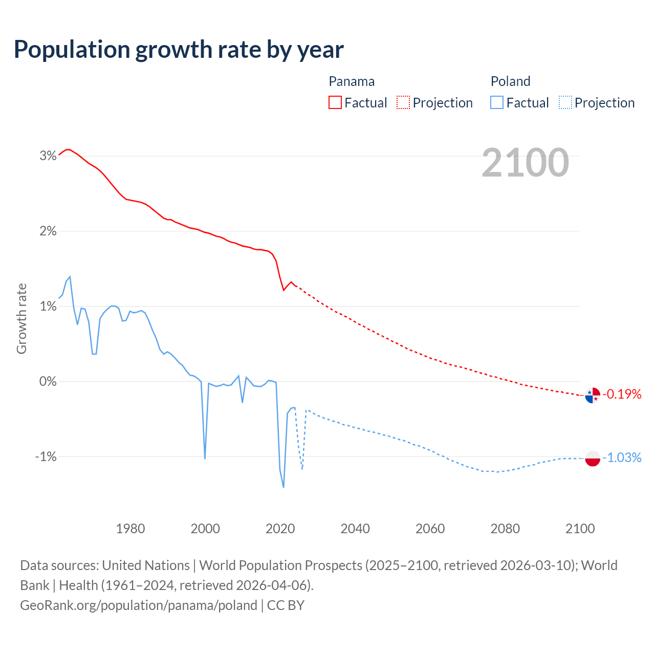 - For the last 10 years, Panama has had an average growth rate of +1.52% per year vs -0.36% in Poland.