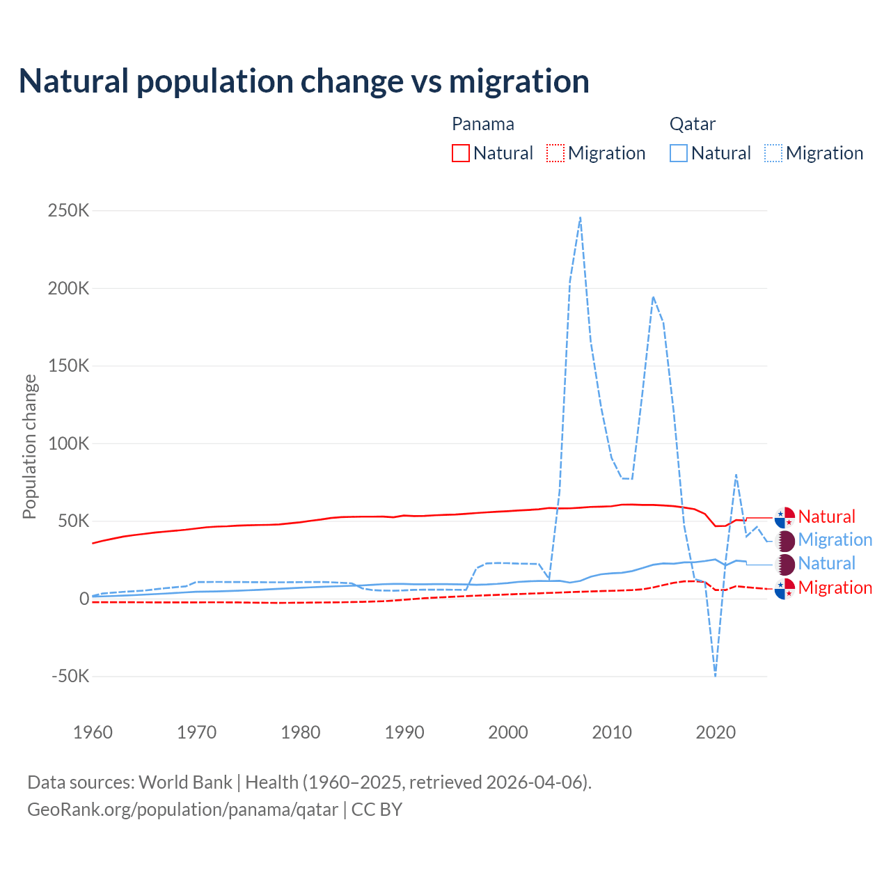 Over the last 10 years, 86.5% of the population change in Panama is from natural causes (a gain of 544,211 people) and 13.5% is from migration (a gain of 84,849 people). In Qatar 26.1% is from natural causes (a gain of 232,009 people) and 73.9% is from migration (a gain of 655,712 people).