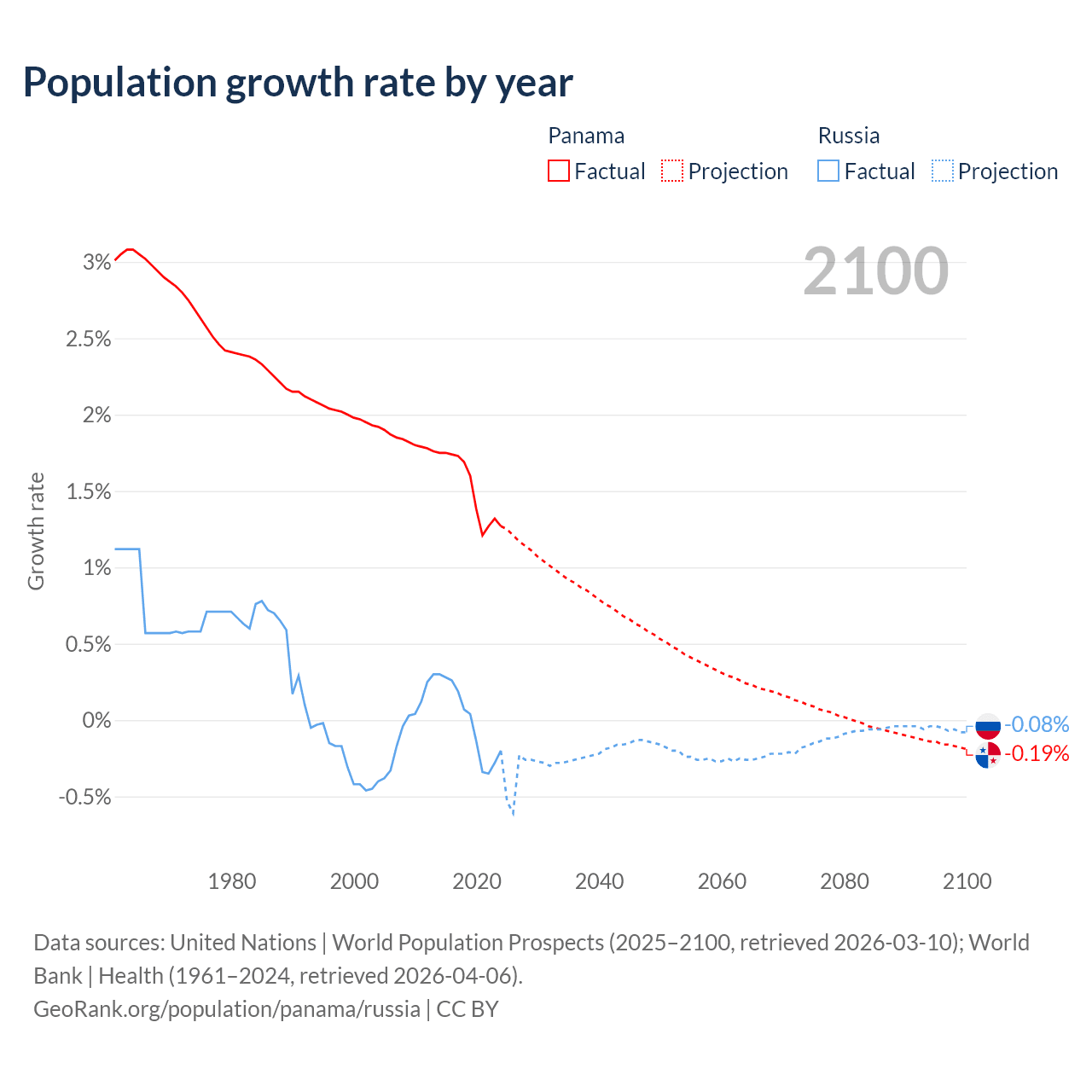 - For the last 10 years, Panama has had an average growth rate of +1.52% per year vs -0.02% in Russia.
