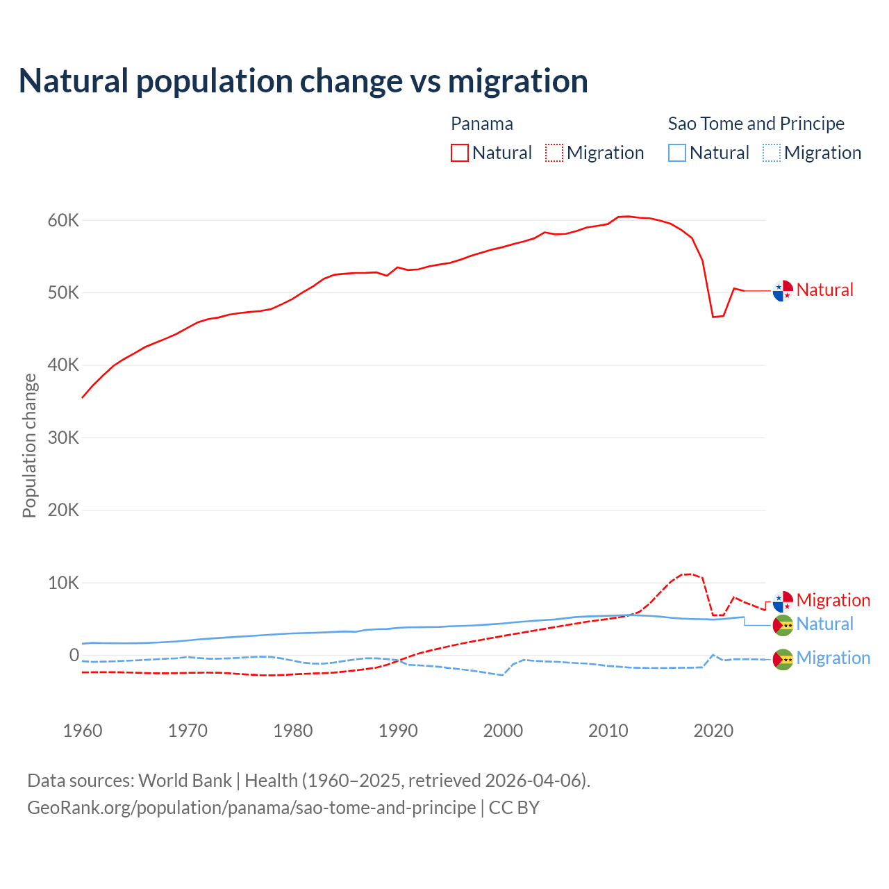 Over the last 10 years, 86.5% of the population change in Panama is from natural causes (a gain of 544,211 people) and 13.5% is from migration (a gain of 84,849 people). In Sao Tome and Principe 80.1% is from natural causes (a gain of 50,822 people) and 19.9% is from migration (a loss of 12,621 people).