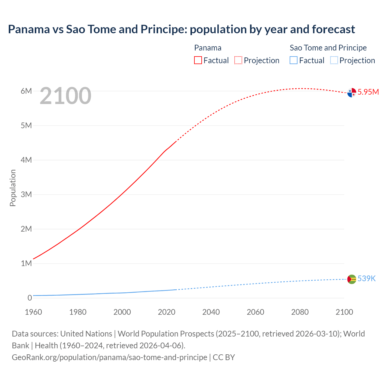 The latest officially reported population of Panama was 4,515,577 in 2024 vs 235,536 people in Sao Tome and Principe in 2024. In 2026, based on the adjusted UN estimation, the current Panama's population is 4,642,198 people compared to 246,362 in Sao Tome and Principe.