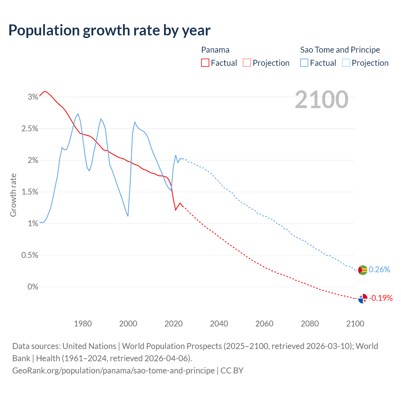 - For the last 10 years, Panama has had an average growth rate of +1.52% per year vs +1.82% in Sao Tome and Principe.