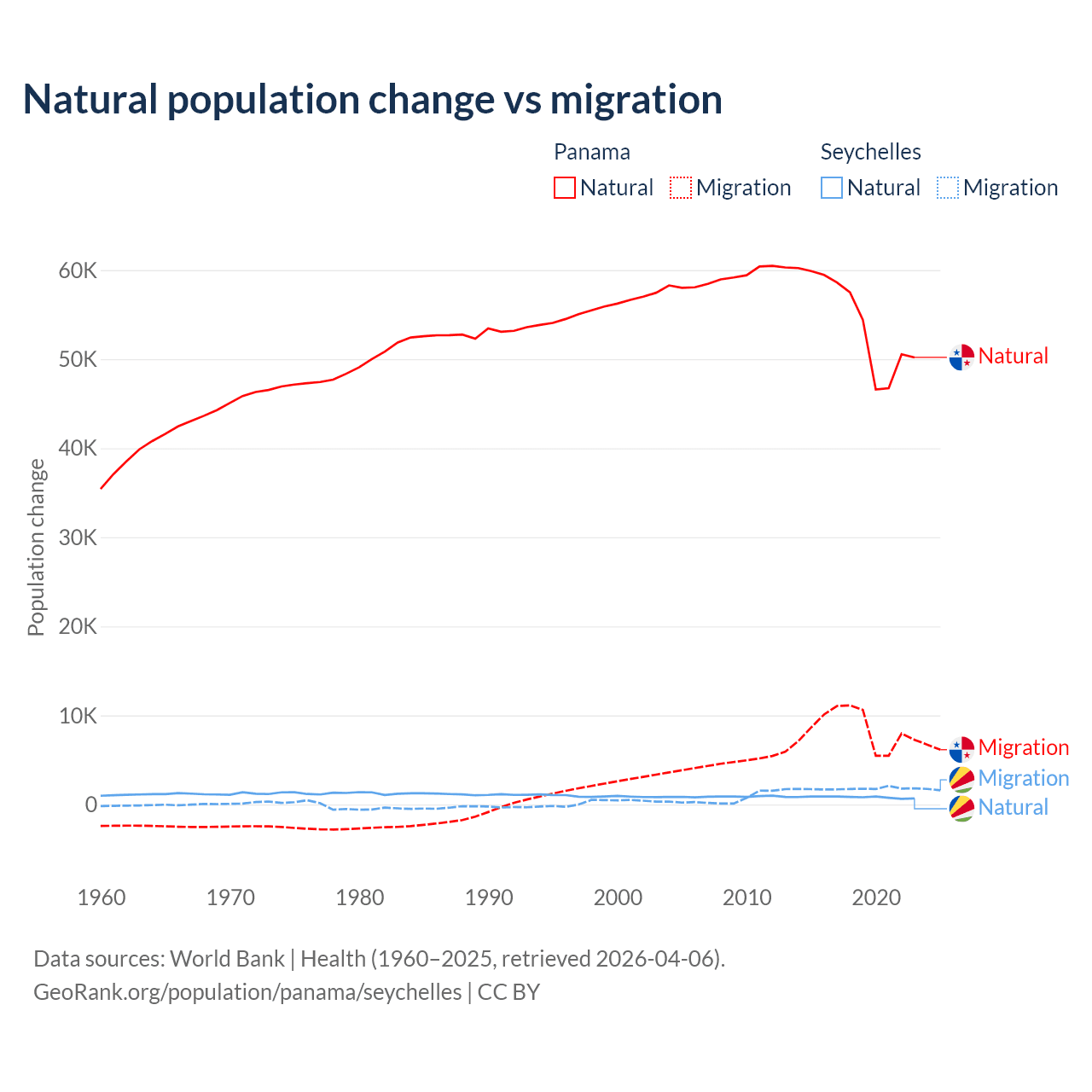 Over the last 10 years, 86.5% of the population change in Panama is from natural causes (a gain of 544,211 people) and 13.5% is from migration (a gain of 84,849 people). In the Seychelles 31.4% is from natural causes (a gain of 8,122 people) and 68.6% is from migration (a gain of 17,748 people).