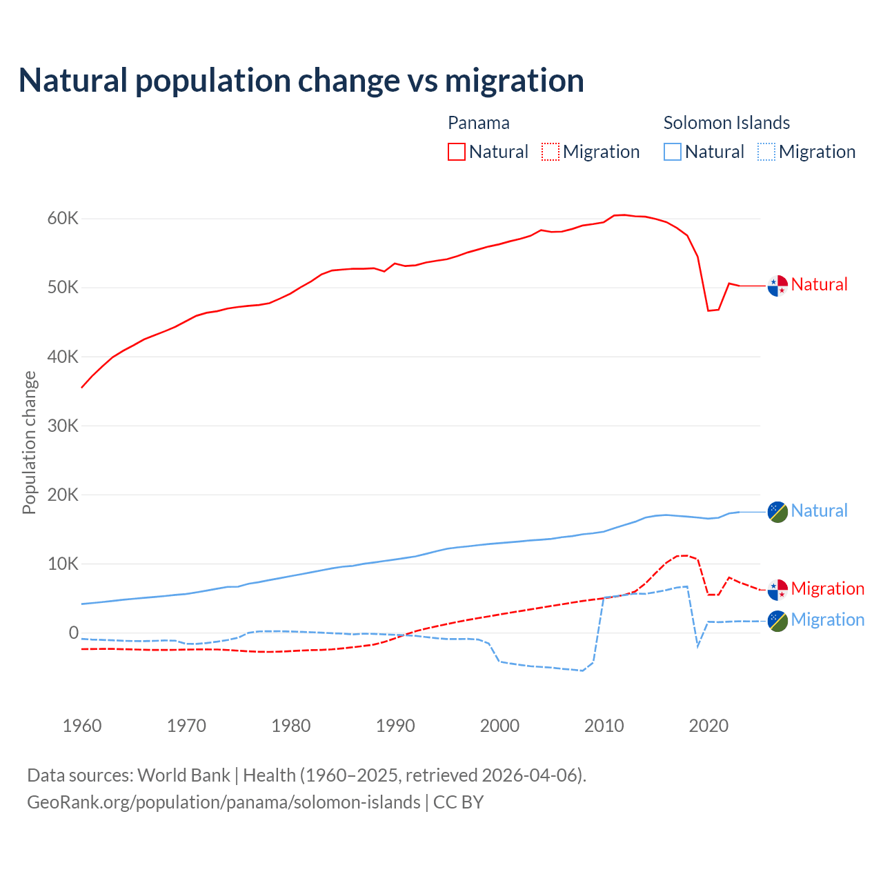 Over the last 10 years, 86.5% of the population change in Panama is from natural causes (a gain of 544,211 people) and 13.5% is from migration (a gain of 84,849 people). In the Solomon Islands 82.8% is from natural causes (a gain of 168,727 people) and 17.2% is from migration (a gain of 35,031 people).
