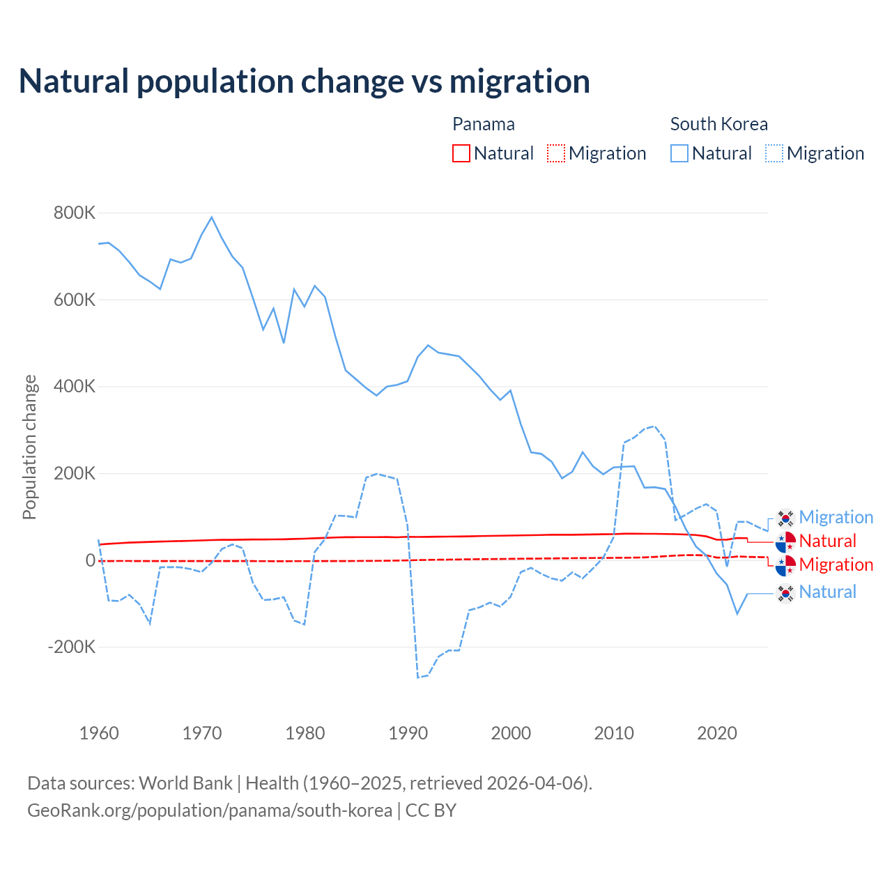 Over the last 10 years, 86.5% of the population change in Panama is from natural causes (a gain of 544,211 people) and 13.5% is from migration (a gain of 84,849 people). In South Korea 17.6% is from natural causes (a gain of 277,215 people) and 82.4% is from migration (a gain of 1,298,356 people).