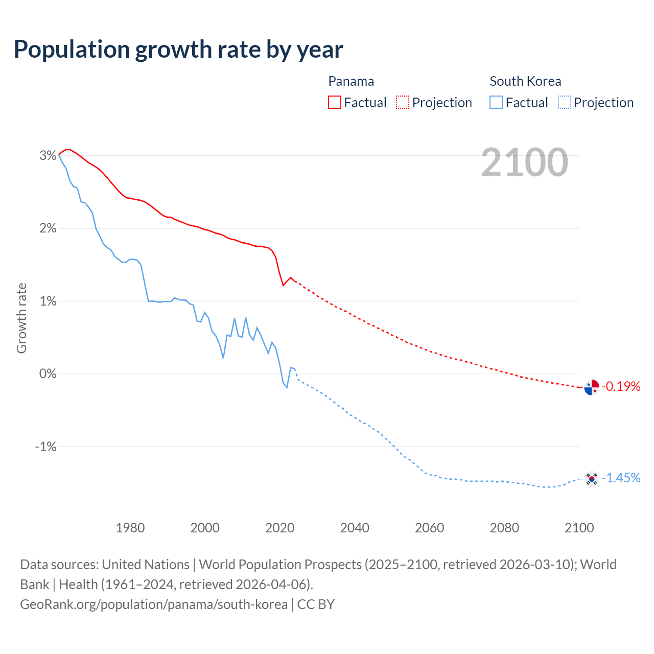 - For the last 10 years, Panama has had an average growth rate of +1.52% per year vs +0.24% in South Korea.