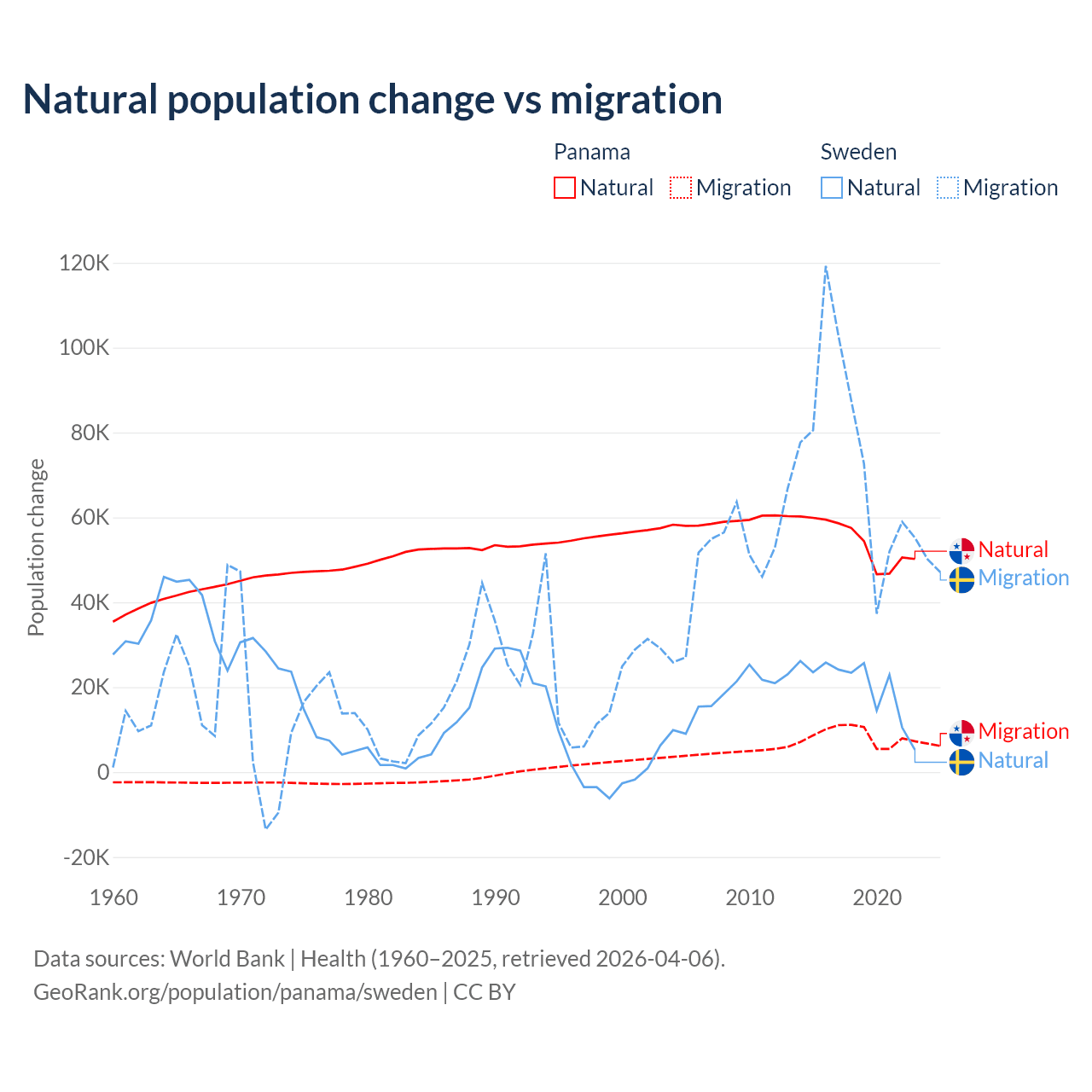 Over the last 10 years, 86.5% of the population change in Panama is from natural causes (a gain of 544,211 people) and 13.5% is from migration (a gain of 84,849 people). In Sweden 21.4% is from natural causes (a gain of 201,900 people) and 78.6% is from migration (a gain of 743,642 people).