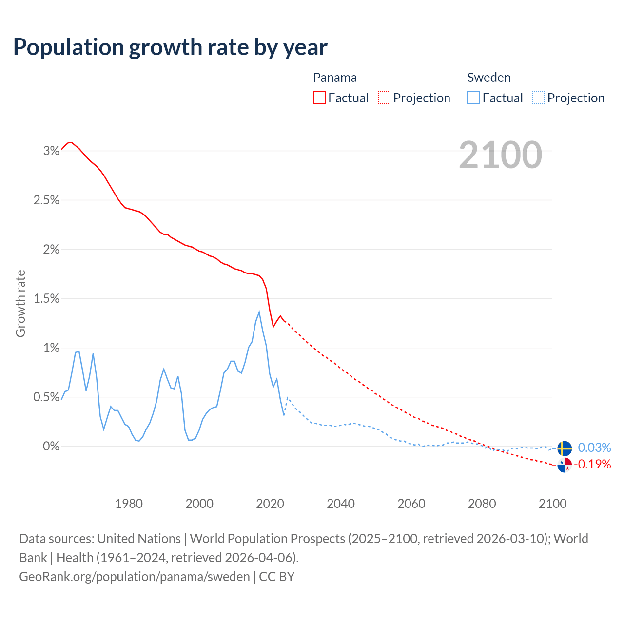 - For the last 10 years, Panama has had an average growth rate of +1.52% per year vs +0.88% in Sweden.